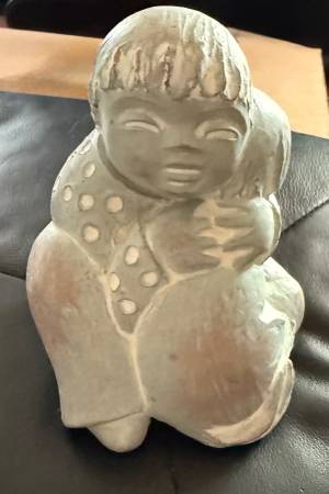 Ttitled "Boy with Dog" or "Boy Hugging Dog”. Signed by artist and in excellent condition. I would describe it as gray green with blush accents. Heavy. Measures approximately 5 inches tall and base...