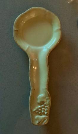 Vintage Portuguese ceramic spoon rest with grape design. Small matching dish is probably meant for keeping salt near the stove. Creamy yellow in color. Spoonholder measures approximately 11.5x5...