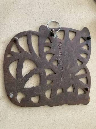 Measures approximately 7x7 inches. Has a beautiful and interesting patina. Has metal feet and hanging hardware on back. Cash only. Pick up in Stillwater.