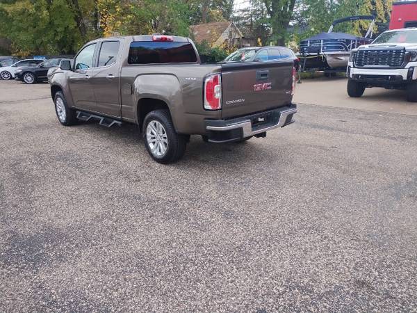 2015 GMC Canyon SLT 4X4 Crew Cab with a 6ft box and 3.6L V6 engine. Subterranean Metallic exterior paired with a Cocoa/Dune leather interior. This 4X4 truck offers up to 24 MPG and is in excellent condition with new tires. It has been fully serviced, detailed, and is ready for delivery. Financing and extended warranty options are available at the dealership. For any questions, contact Triangle Auto at 651-213-3403.