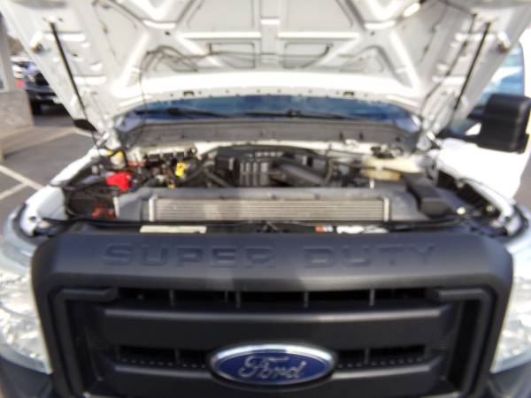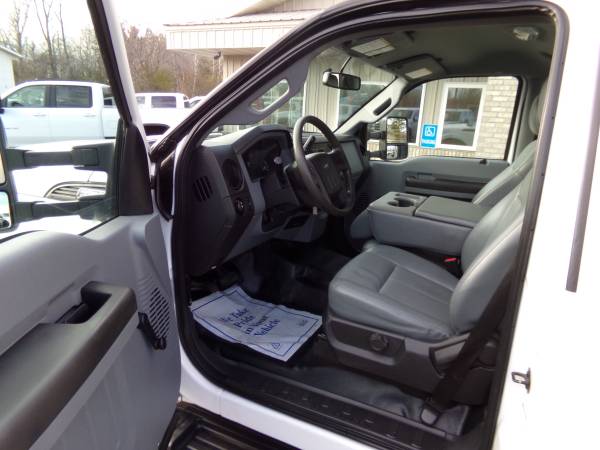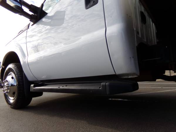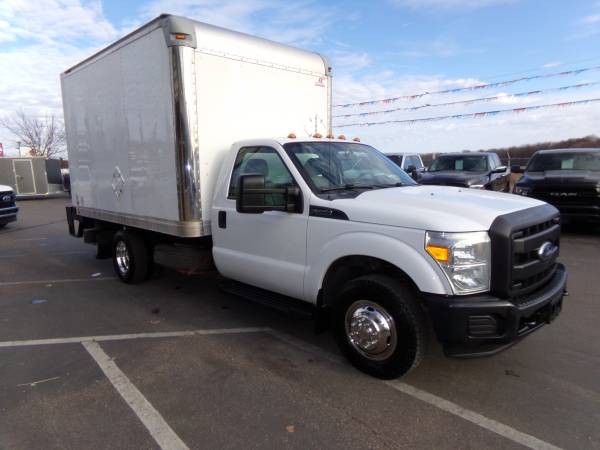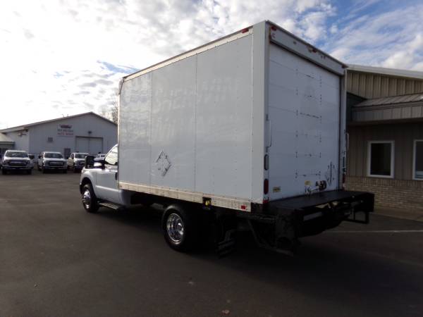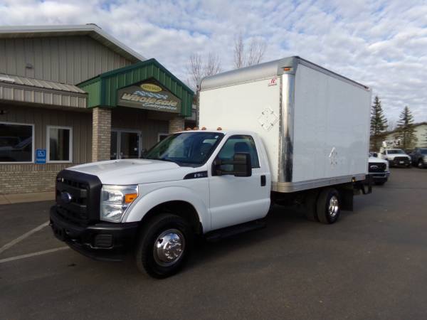 Solid, out of state F350 DRW RWD cube truck with gas 6.2L V8. 14,000 lb. GVWR. 4.10 gears with limited slip. Inside of van is 12' deep, 7.6' wide, & 6.5' tall. XL pkg. with a/c, tilt, cruise, am/fm/stereo, split bench seat, Tommy lift end gate, running boards, roll-up door, up-fitter switches, mud flaps, clearance lights, and more. Professionally detailed, good tires, runs and drives great with 109,889 miles.