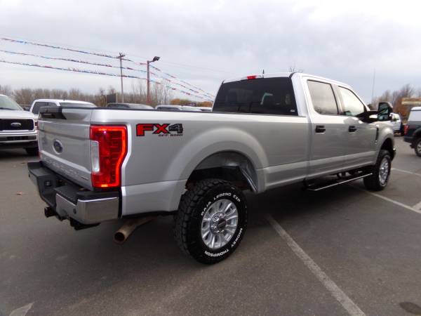 Solid, out of state crew cab long box 4x4 with gas 6.2L V8. XLT cloth interior pkg. with power options, remote start, tilt, cruise, backup camera, overhead console, am/fm/bluetooth stereo, 6 passenger seating, tinted windows, 3rd trailer brake controller, tow pkg., camper/tow mirrors, aluminum wheels, sprayed in bed liner, running boards, FX4 off road pkg., fog lights, and more. Professionally detailed, newer tires, runs and drives great with 85,782 miles.