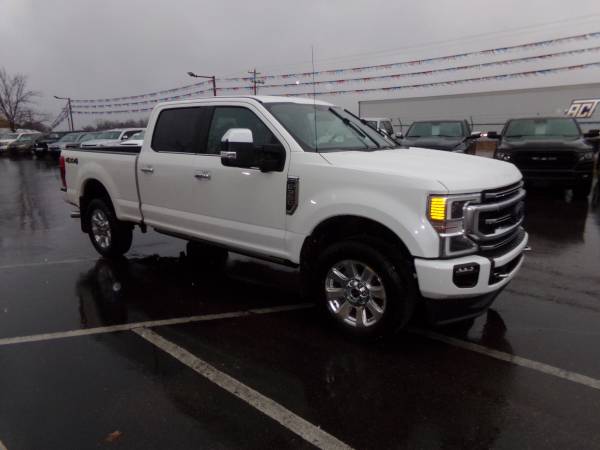 2020 Ford F-350 Crew Cab Short Box 4x4 with 7.3L Gas V8. Loaded PLATINUM pkg. with heated and cooled leather bucket seats, heated rear seats, full power options, remote start, backup camera, dual climate control, large screen am/fm/bluetooth stereo system, steering wheel controls, overhead console, tinted windows, overhead console, up-fitter switches, 3rd trailer brake controller, trail/tow pkg. with backup assist, full power camper/tow mirrors, power running boards, sprayed in bed liner, aluminum wheels, fog lights, lane departure, sliding rear window, mud flaps, and more. Professionally detailed, good tires, runs and drives great with 148,835 miles.