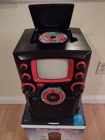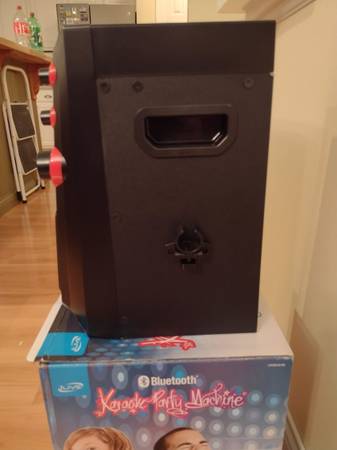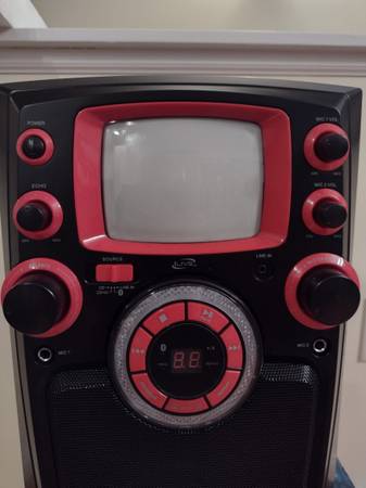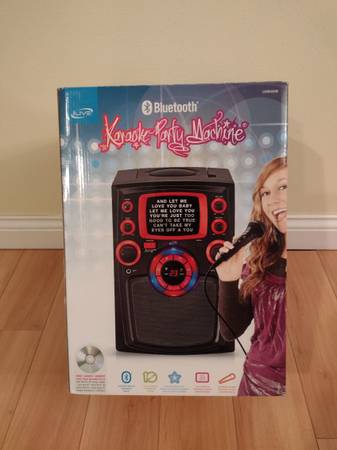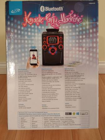 Karaoke with Bluetooth, CD, and Microphone. Two mic inputs, wireless Bluetooth range is 60 feet, auto voice control, echo and mic controls. Used 2 times, like new. Great for kids or anyone learning to sing.