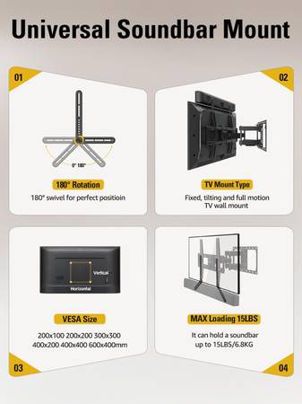 NEW Mounting Dream Soundbar Mount for under or above TV. Adjustable and compatible with wall mounts (fixed, tilt, full-motion), VESA up to 600x400 mm, holds up to 15 lbs.