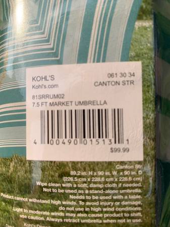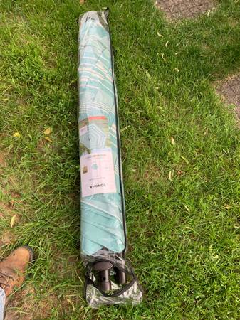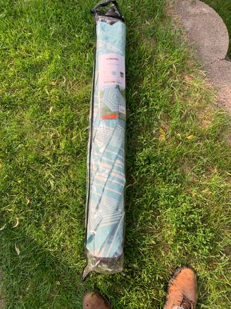 New, never used 7 1/2 foot patio umbrella green and white. Bought from kohls years ago for $100. Probably more now. Asking $40. .