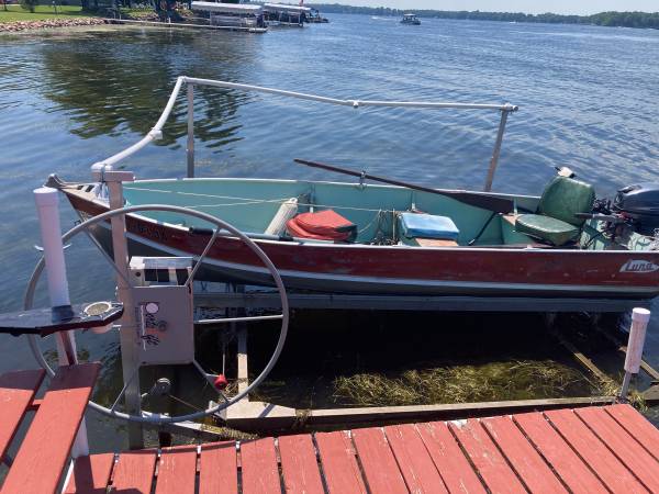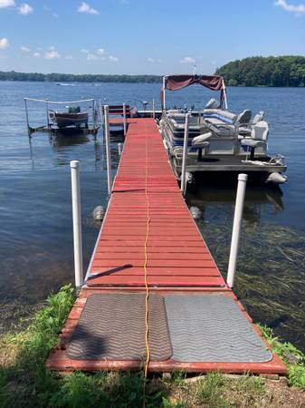 Rolls in easy. Adjustable winch underneath for easy height adjustment depending upon your lake depth. Cedar decking in good condition. Good custom black plastic dock tires. Sitting bench for two....