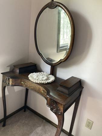 Dressing Table. Queen Anne. ANTIQUE. Rare. All Wood with Mirror and cast hardware. Built in jewelry boxes. Condition: Good. Mirror moves. One Drawer. Gorgeous. From the Mn area. All Item's Sold As Is. All Item's Sold Are Final Sale's. Price: $2,400.00. CASH ONLY. Buyer to pick-up.