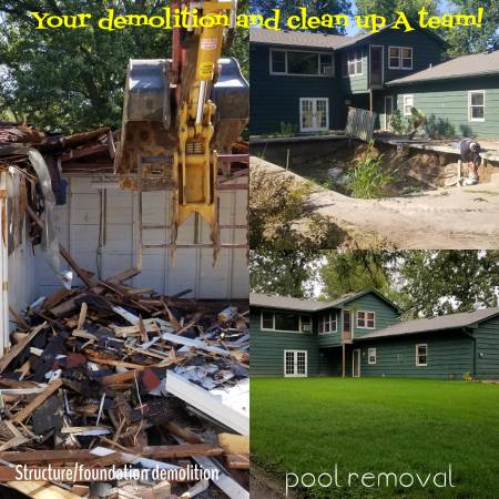 Licensed and insured Demolition services. Demolition, land clearing, clean up, removal and more. Buildings, rocks, concrete, trees, brush, stumps, scrap, old machines, cars, silos, grain bins,...