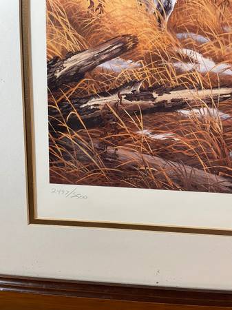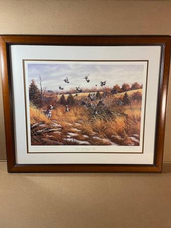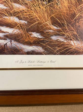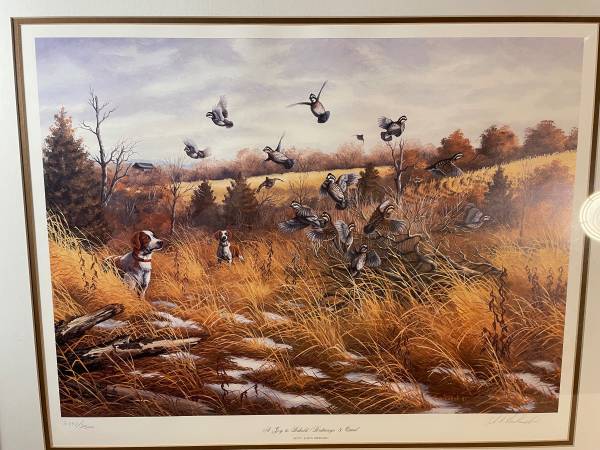 Nice wildlife print of hunting dogs flushing bobwhite quail . Double matted singed and numbered by artist John S. Eberhardt. 2497/2500. Titled “A Joy to Behold /Brittanys and Quail”. Overall size...