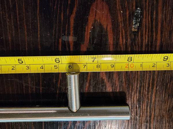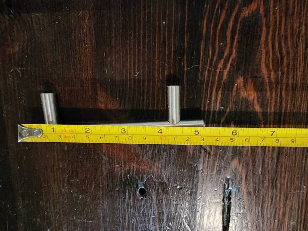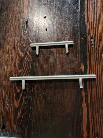 I have 34--9 1/2" Long, 6 1/4" on center cabinet handles Also I have 12--5" long, 3 1/2" on center cabinet handles. good condition. The whole lot for $25.00 Cash Only