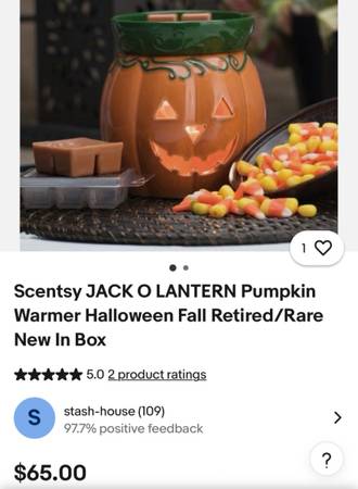 Retired Scentsy Jack O’Lantern-New In Box. Asking $30 cash. Compare to eBay-$65, Mecari-$45.55. Clean, smoke free, pet free home. Easy functional Halloween Pumpkin decor!