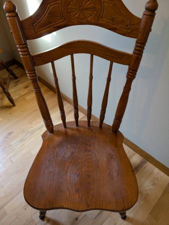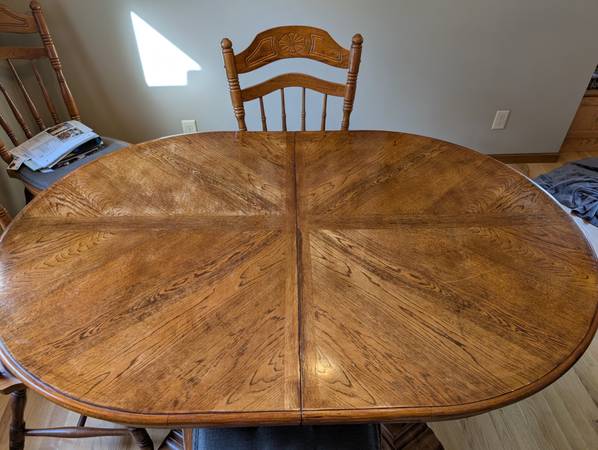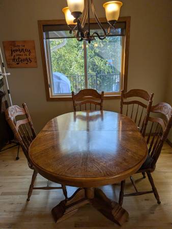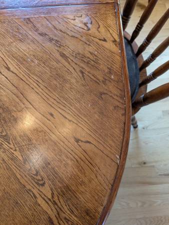 I have a wonderful heavy duty kitchen table and chairs for sale. I am only selling because I need something more wheelchair friendly. It comes with an 18 inch leaf. The leaf has a little different color because at one point I refinished the top of the table. Since then a box was drag crossed it and left a mark which is seen in the pictures. You can easily use a remover to just wipe off the top finish and redo again. The chairs have a cushion on them and they have been there so long that when I removed for pictures you can see some slight wear on the chairs. They come with the cushions. Table is heavy but can come apart in a couple of pieces.