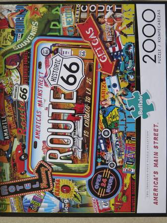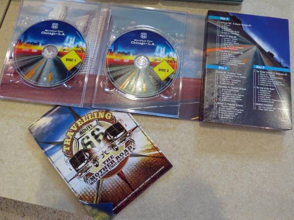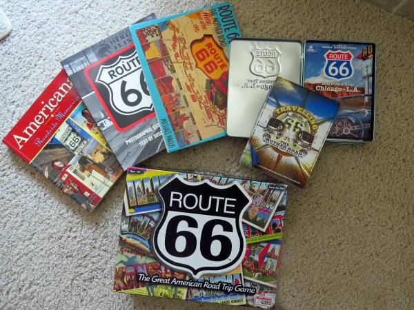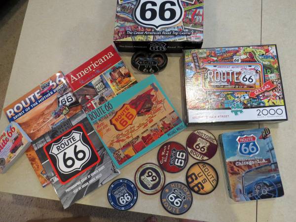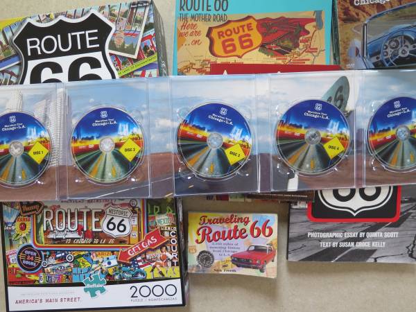 This lot of Route 66 items would make a nice gift for a travel buff, or even a theme for a retirement party, encouraging them to travel the USA! It includes 5 DVDs, a collector tin, (postcards are missing), books, drink coasters, salt & pepper holder, and a puzzle. The Buffalo 2000 puzzle alone is worth $20 on the used market. The puzzle is complete, worked only one time. These items are in excellent condition.