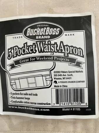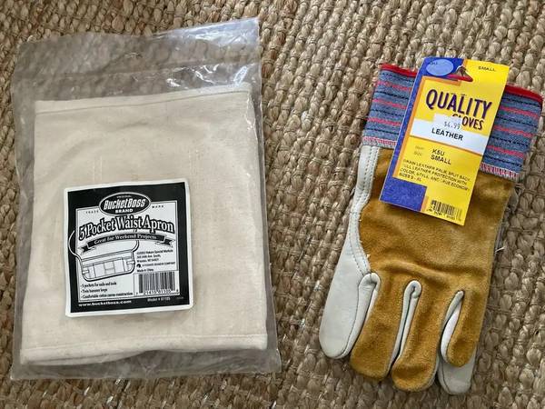 Bucket Boss 5 Pocket Waist Apron #81105 $15 Quality leather work gloves sz S $10 Take both for $20 Cash only. Pick up in Stillwater.