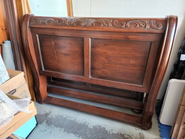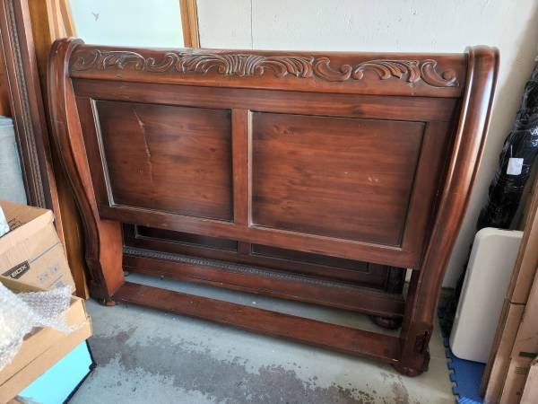 This Queen bed is in very good condition! Headboard, matching footboard and wood frame included. No mattress included.