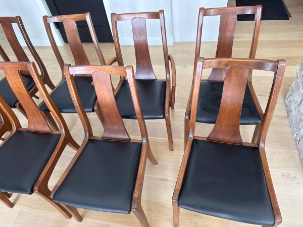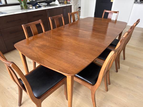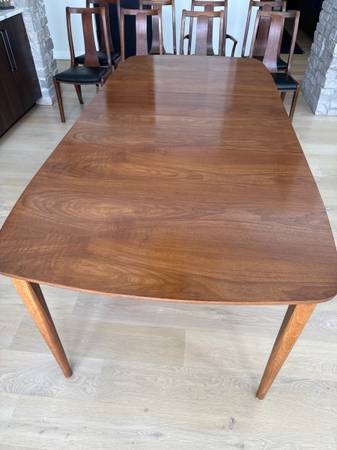 I need of more seating so selling this Mid century modern style table. Walnut dining table with 8 chairs. It has been used but in great shape. Some of the chairs will benefit from service as the joints are “loose”. Everything completely functional though. 24 inches can be removed for a smaller table as needed.