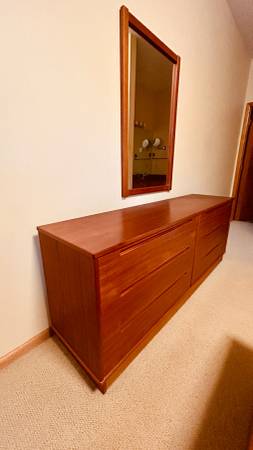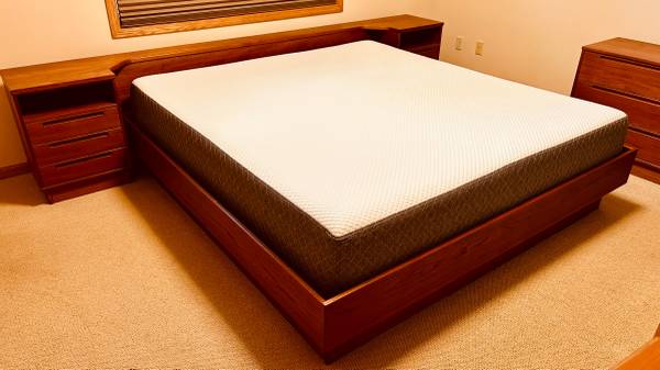 BED: A Danish teak wood king-size platform bed set with built-in nightstands, three drawers to each side, with a matching teak and wood slats platform with middle bracing for the mattress section. The entire thing can be easily disassembled and reassembled.