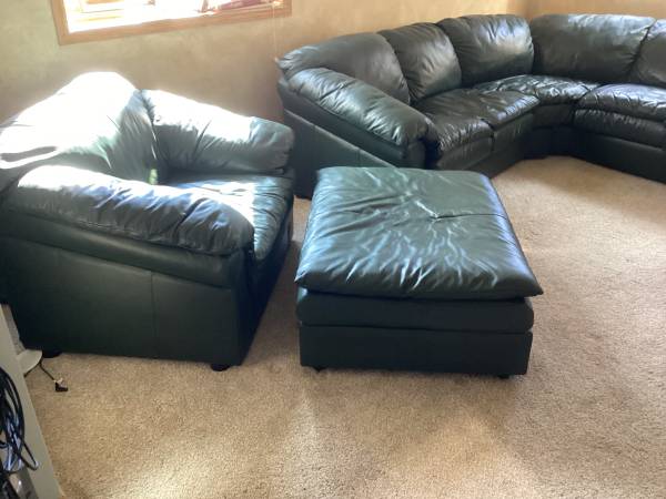 One owner bought new used very little, Sealy leather alpine green sofa,chair,ottoman with coffee/game table…offered as a package deal! Excellent condition