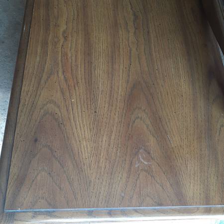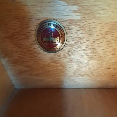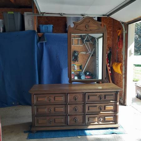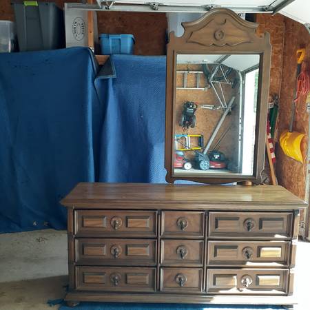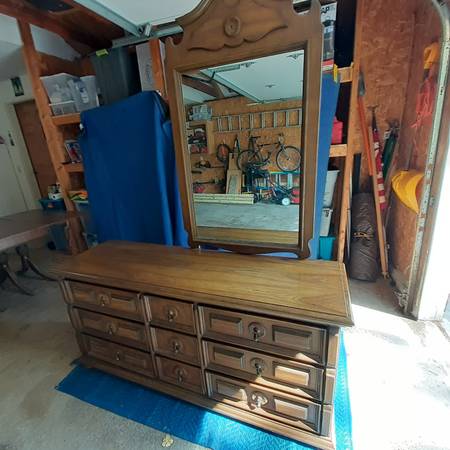 Bassett dresser with mirror, solid wood, good condition, couple glass rings on top surface. 68" wide x 20" deep x 31" high. 84" high with mirror. Text Steve at