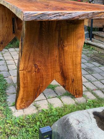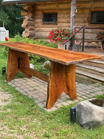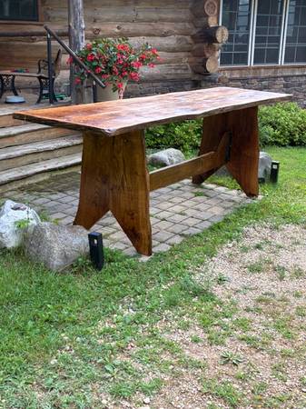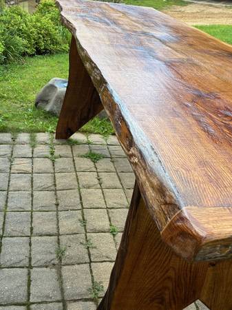 This all oak trestle style bar is a very heavy, rustic one of a kind piece that is sure to spark plenty of conversation. It has live edges all the way around and black iron connections at all the corners. It can easily be taken apart to load in at it final destination, if necessary.