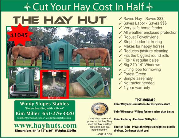 By using a Hay Hut covered hay feeder it extends the life of each bale you feed and reduces waste. The Hay Hut keeps the hay out of the elements.
