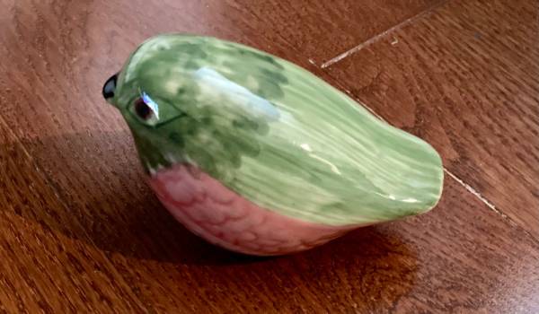 Green and pink ceramic bird figurine. Originally from Creative Co-op. Approximate size is 3 3/4" x 2 1/4". Made of Stoneware, Hand Painted and has a glossy finish. Excellent condition. Cash only....