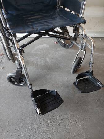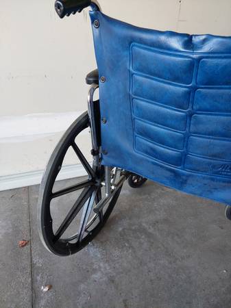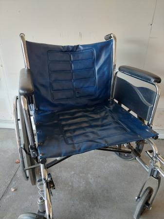 Tracer IV Wheelchair with 22" wide seat. Weight capacity 350#. Heavy, very sturdy. Padded arm rests are about 9-1/2" above seat. Adjustable and detachable foot rests. The seat is 17-3/4" deep. To fold, pull up on the front of the seat; folds easily. When folded, is approximately 12" wide by 42" long.