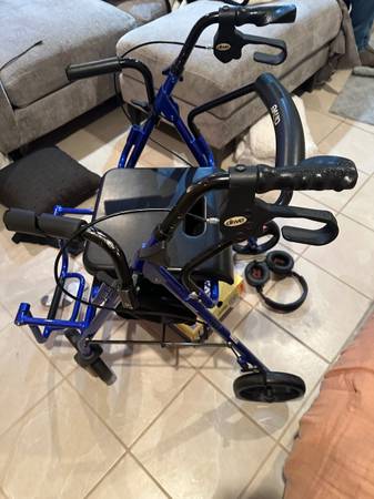 Gently used walker with foot rest and storage. Both brakes work and is rated for 350 pounds