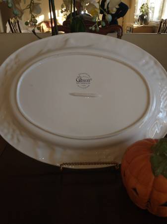 I have a very nice glossy white serving platter made by Gibson. It is microwave and dishwasher safe. The size is 18-19" in length, by 14". Around the top edge is rimmed with exotic fruits, in a raised textural pattern. It has a rimmed bottom for strength of design. A very nice platter for your Thanksgiving, Christmas, Easter turkey, chicken, or ham. Also great for a party with meats, cheeses, crackers, snacks, treats, chocolates, etc. You could even use it as a centerpiece, adding fruits, candles, ornaments, greenery. In great condition, like new. The neutral white color goes well in any kitchen or dining room. (gold stand not included). Asking $10 cash only. Can pick up or can meet at McDonalds by I-35 in Forest Lake. If ad is still on, item is still available. Please leave contact info, and I will contact you ASAP. Thank you.