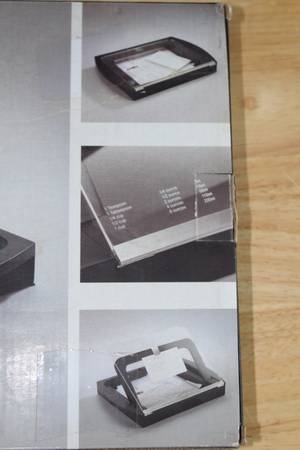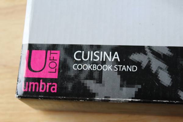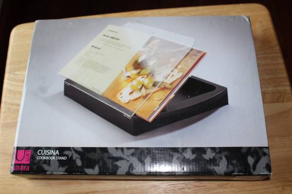 Great brand new, in packaging cookbook stand. Cuisine brand, black, Umbra Loft brand. Includes measuring conversions on the acrylic cover along with a clip for recipe cards and recipe card storage. Measures ~10" x ~14" x ~2". From a smoke-free home.