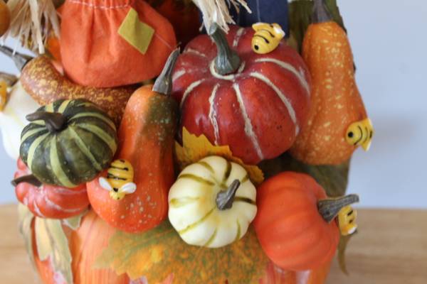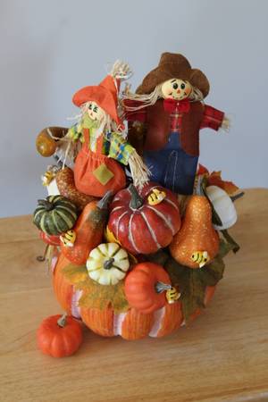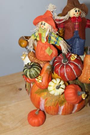 Very cute fall decoration, ready to grace your home! Decor was purchased from a local craft show but was unable to be used due to space constraints. Decor piece features an orange pumpkin base topped with fall leaves, a male and female scarecrow, squashes, gourds and pumpkins, and finished with cute bees. The entire unit measures ~13 inches tall x ~10.5 inches wide x ~10 inches deep. Comes with bonus small pumpkin decor piece. All items from a smoke-free home.