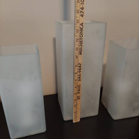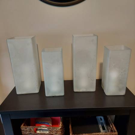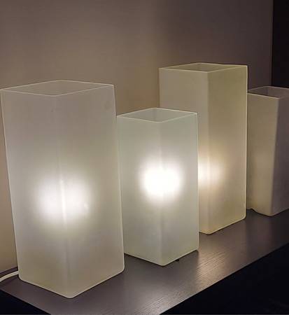 Glass Table lamps - set of 4 frosted glass. 2 fixtures- 5.5x5.5x14 high and 2 fixtures 4.5x4.5x 11 high. Great as a group on a sideboard or buffet OR split on night stands. Great Bargain as $25-35 each on Ebay! All 4 as a set just $40. Light blubs included. Pick up in Woodbury near East Ridge High School