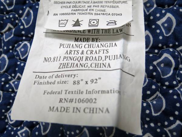 A beautiful queen size quilt can also be used on a full bed if you want sides to reach the floor (photo shows it on a Queen bed.) 88" x 92" This comforter is in like new condition. Reverses to a crisp navy print. I didn't have a bed skirt so it languished in the closet. 100% cotton.