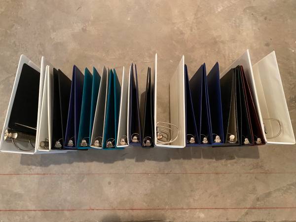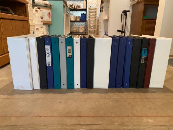 3-ring binders for FREE. There are 15 one-inch binders, 2 three-inch binders and 1 four-inch binder, all various colors. Take as many as you like. Must pick up.