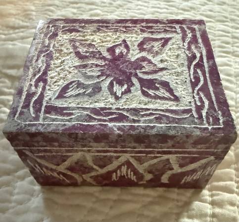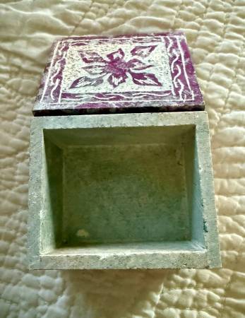 Soapstone box carved with intricate design. Excellent condition. Lid is tight fitting. Measures 2x2.5x1.5. Cash only. Pick up in Stillwater.