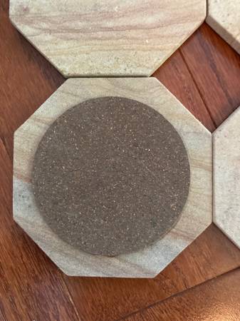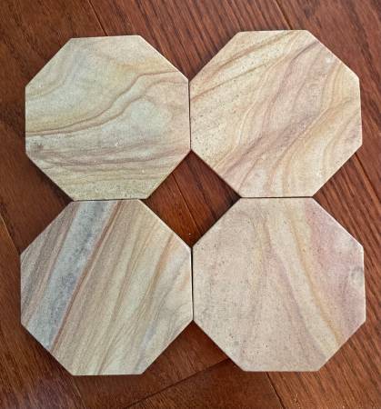 Octagonal Sandstone Coasters with Cork Backing Will readily soak up any condensation to protect your surfaces. In like-new condition. Cash only. Pick up in Stillwater.
