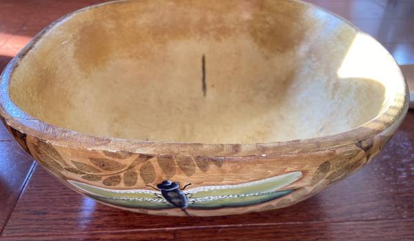 Decorative wooden bowl with dragonfly design. This is a lightweight bowl in excellent condition. Measures approximately 10 inches in diameter and 4 inches deep. Pictured with a stoneware dragonfly...
