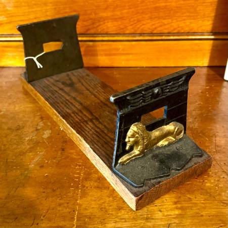 Bookrack made from antique iron bookends and oak: Egyptian Sphinx motif; solid and sturdy; 14”Length, 4” Width, 4 1/2” Height. $45. Bob