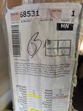 Brand new, never installed - 84" wide x 51" high, Jeldwen Tradition Plus Clad Double Hung, Premium Pocket Unit, 2 Wide Frame, Dark Chocolate Exterior, Pine Natural Interior, White Jambliner, Antique...