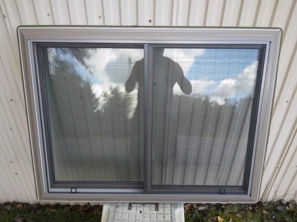 Never installed, quality vinyl slider. Clay exterior/oak interior. See pictures for size. $50 cash