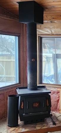 Wood burning stove. Comes with the full chimney 8". Has been removed and disassembled during remodel. Cash/Venmo only. Local pick up only. It is heavy, I can help loading but might need extra person...