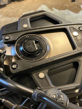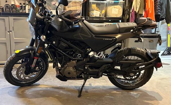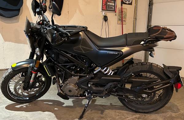 Husqvarna Svartpilen 401. 1,400 miles with 600 mile break-in service performed by dealer. Purchased new in April, 2024. Farkles include Leo Vince GP-One slip on exhaust, Barkbusters (rare single sided-I found these in UK!), fly screen, rear rack, Duluth Pack front/rear bags, Luimoto tank grip pads, Battery Tender. I have all OEM parts.