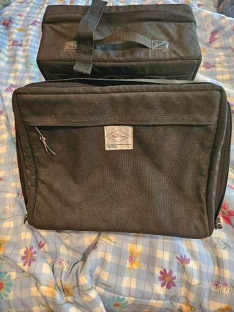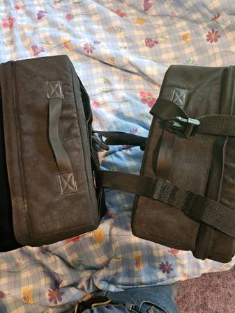 May be used for motorcycle or bicycle. Each is 17" wide x 12" tall x 6" deep. These are heavy duty, thick material, well made.