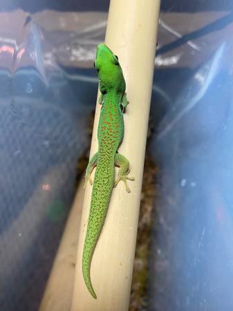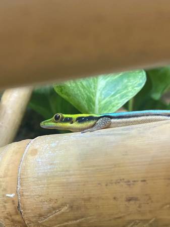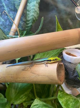 I have some phelsuma quadriocellata or peacock day gecko juveniles as well as some young adult male phelsuma klemmeri or neon day geckos looking for some new bamboo to call home. Please reach out with any questions! I’d love to talk to you about care for these guys if you’re new to day geckos or reptiles in general. Very bold and fun to watch geckos!