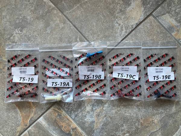 Set of five brand new speedometer pencil gears (driven gear). Fits Muncie and Borg Warner Super T10, T10, T5, Saginaw, Powerglide, TH350, and others. Color codes: Black 23 tooth GM10049, Red 21 tooth GM10038, Blue 20 tooth GM10037, White 19 tooth GM10036, Brown 18 tooth GM10035. Originally purchased directly from Allstate Gear for $102. $30 total for the set of five gears. Sold only as a set.