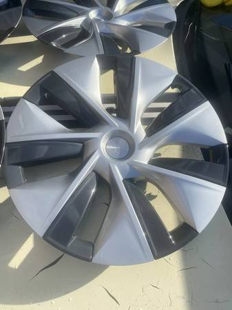 Per Tesla: "Fits Tesla Model 3 2017-2021 Tesla Model Y 2020-2023 Product ID: HTA042 Hubcap/Wheel Cover Plastic 7 Spoke Silver/Charcoal Painted Size: ONLY Fits 19 Inch Alloy Wheels