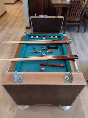 Circa 1965 all original cloth, balls, and with very rare copper bumpers. 3/4-inch slate table with aluminum corners and trim. Rails and sides are covered with a walnut finished laminate.