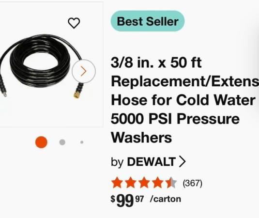 Never used, DeWalt 5000 psi pressure washer hose. 50 ft x 3/8" (Bought the wrong one.)
