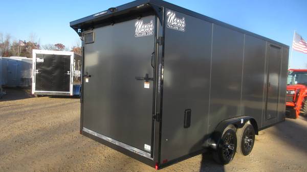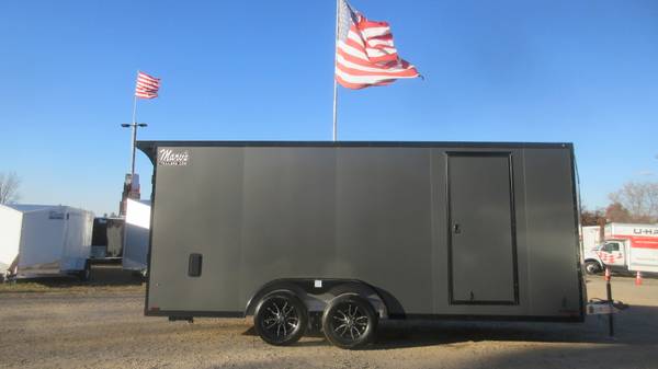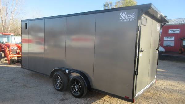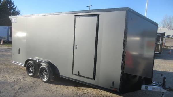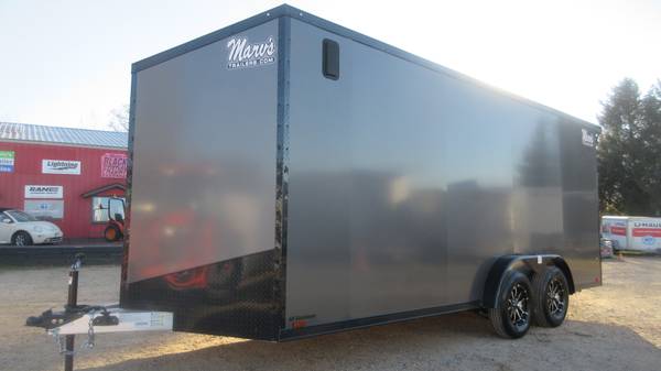7.5' x 18' + 2' v-nose Lightning LTF Aluminum Enclosed Trailer (2025 Model), Metallic Charcoal with BLACKOUT trim package, 2-3500# spring axles with electric brakes, D-Rated 205/75R15 radial tires, black accent aluminum wheels, 1 piece aluminum roof, 24" ATP stone guard, ramp door with extension, side door with RV style latch, white vinyl interior walls, multi-directional Salem side air vents, rear spoiler with LED loading lights, pre-wired for Furrion backup camera, .080 Poly composite skins, 2 rear stabilizer jacks, 4 heavy duty recessed floor d-rings, 80" interior height, LED clearance lights, LED tail lights with integrated backup lights, 2 interior lights and more.